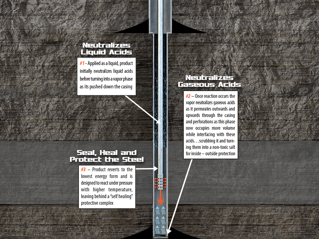 - Once the liquid becomes a gas due to ambient pressure and temperature, it will penetrate the perforations and begin its natural migration upward, finding openings, fissures, cracks and voids…coating and healing the casing as it moves up.